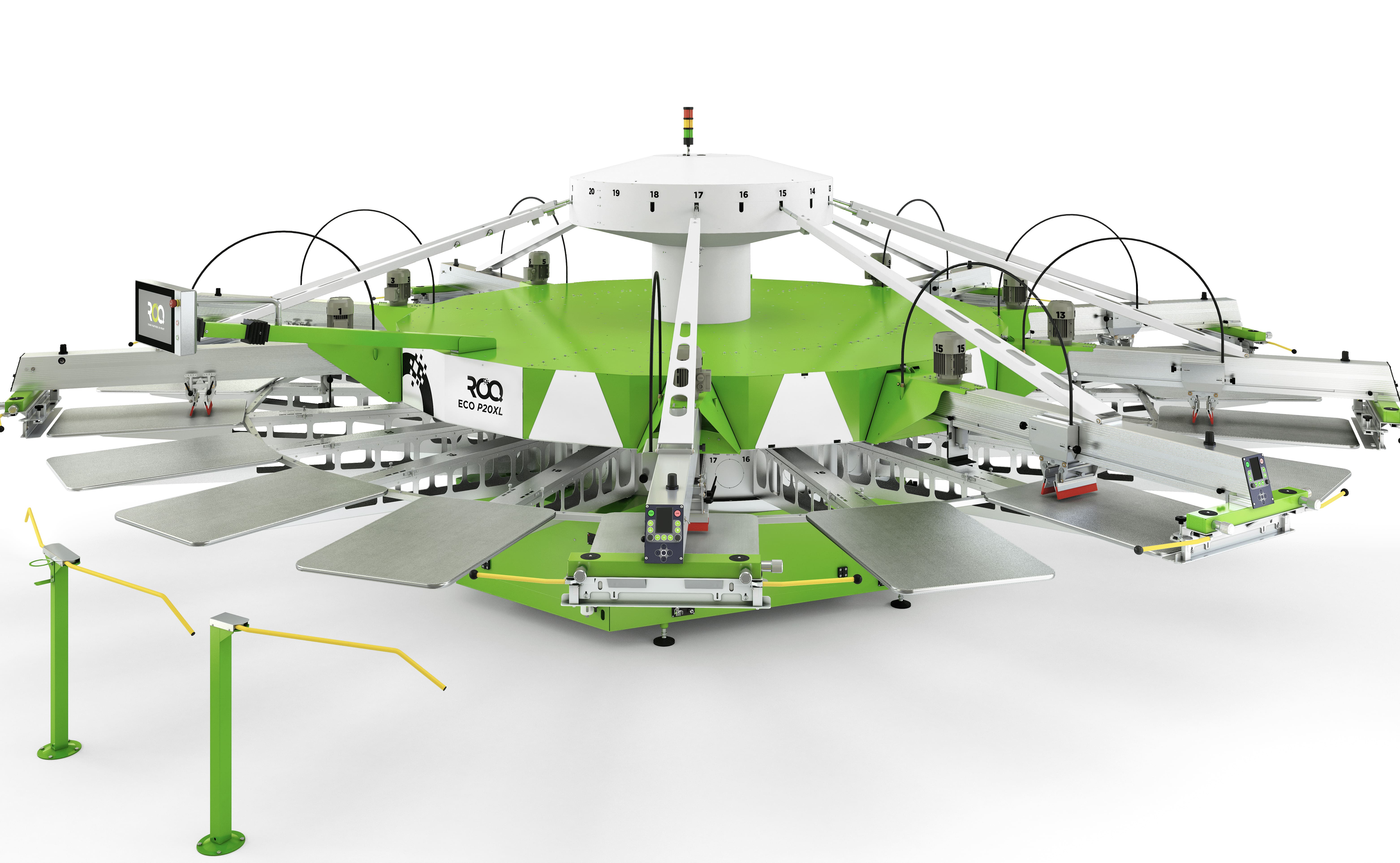 The ROQprint Eco incorporates ROQ’s latest technological innovations. Which have been already tested and proven by our customers in their shops. It ranges from a minimum of 12 pallets up to a maximum of 20 pallets and from a minimum of 1 color up to 18 colors. The print area goes from 450 mm x 550mm up to a maximum of 800mm x 1100mm. The screen printing machine ROQprint Eco is the ideal choice for the most demanding printer for it as an efficient response for every task. Capable of outputting a maximum of 1300 pieces per hour this screen printing machine is a powerhouse. As an added bonus this platform is the carousel screen printing machine that best uses the ROQflock and ROQfoil modules due to its independent print head elevation feature. This elevation system makes this screen printing machine especially efficient in printing with water based inks due to the fact that the printer can manage the time that the screen are in contact with the hot pallets. Being less time in contact means less evaporation of the inks, leading to less stops during the printing of the job, leading to more earnings for the shop.